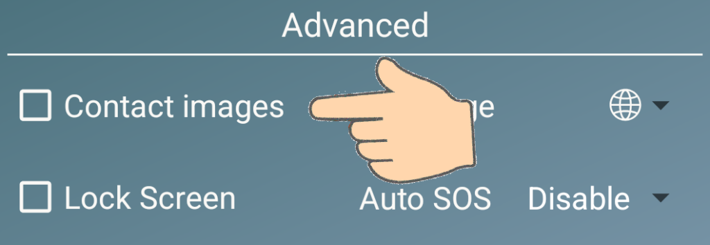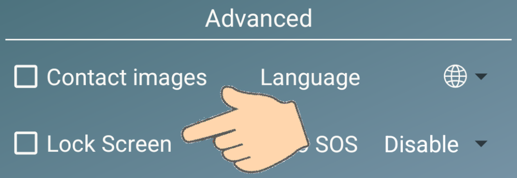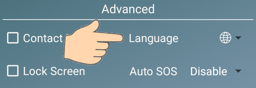 By default, Elder Dialler seeks to use the system language used by the phone (if supported), as indicated by the white globe icon. If desired, the language used by Elder Dialler can also be different to the system language on the phone by use of the language selector.
