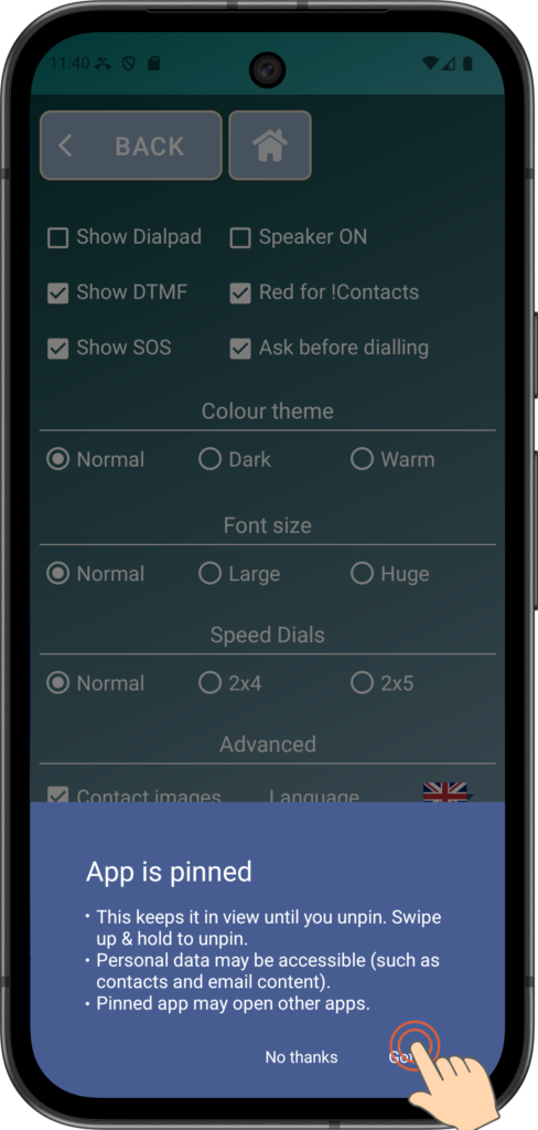 The Lock Screen preference pins the phone to the Elder Dialler application so that the device cannot be exited to other apps or the home screen easily.