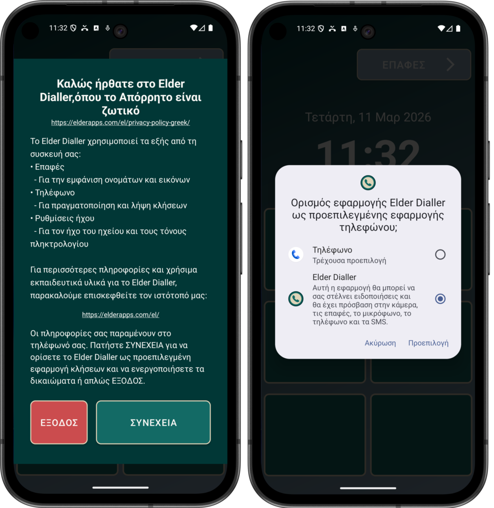 Σημειώστε ότι μπορείτε επίσης να καταργήσετε αυτήν την άδεια ανά πάσα στιγμή από το μενού Ρυθμίσεις (μεταβείτε στις Ρυθμίσεις -> Εφαρμογές -> Προεπιλογή εφαρμογών ->Φώντα), αλλά αυτό θα αναιρέσει όλα τα οφέλη Elder Dialler.