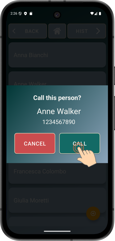 Select ‘CALL’ to call the contact (Anne Walker in this case)