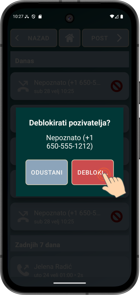 Možete deblokirati bilo kojeg blokiranog pozivatelja na isti način (tj. Dugo pritisnite na blokiranog pozivatelja, a zatim odaberite DEBLOKIRAJ)