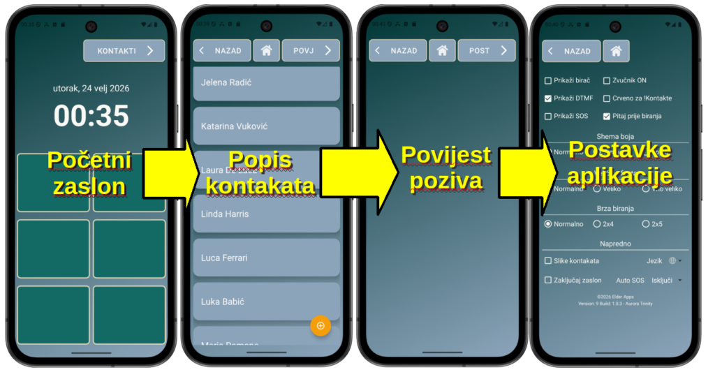 Elder Dialler je osmišljen s četiri glavna korisnička zaslona kojima se pristupa pomoću gumba na vrhu zaslona.