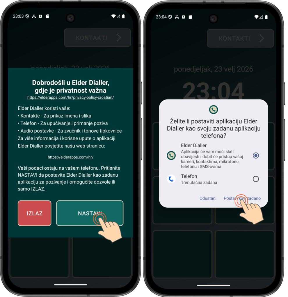 Time će se prikazati zahtjev za postavljanje zadane aplikacije za pozive. Aplikacija zahtijeva dozvole za „zadanu telefonsku aplikaciju” kako bi mogla upućivati i primati pozive te pristupati kontaktima.