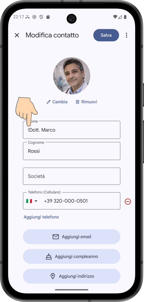 Quando i nomi dei contatti contengono un punto esclamativo (!) aggiunto in qualsiasi punto del nome all’interno dell’applicazione Contatti, i pulsanti associati sono evidenziati in rosso.
