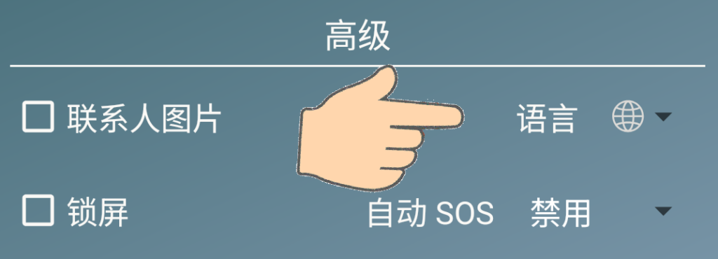 默认情况下,Elder Dialler 会尝试使用手机所设置的系统语言(如果受支持),这一点可通过白色地球图标识别。如有需要,也可以通过语言选择器,将 Elder Dialler 使用的语言设置为不同于手机系统语言的其他语言。