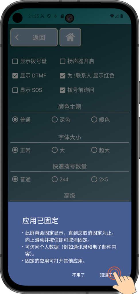 “屏幕锁定”设置会将手机固定在 Elder Dialler 应用中,使设备无法轻易退出到其他应用或返回主屏幕。