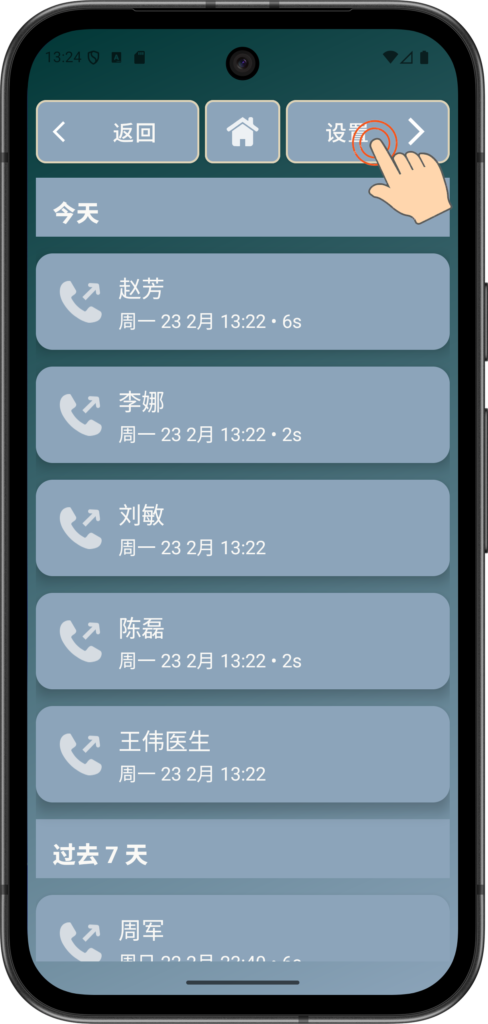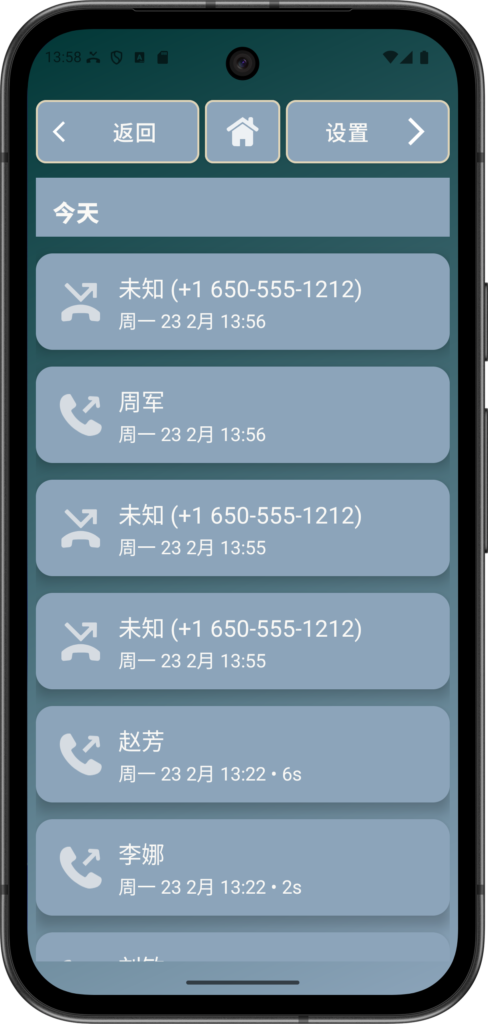 通话记录可帮助老年用户轻松查看与谁通话以及通话时间,减少困惑和重复拨打。用户或其照护者也可以快速回拨未接来电,无需重新输入号码。这增强了信心,并确保不会忘记重要来电。