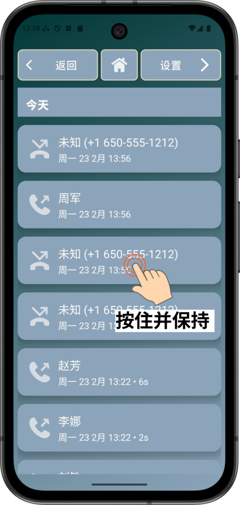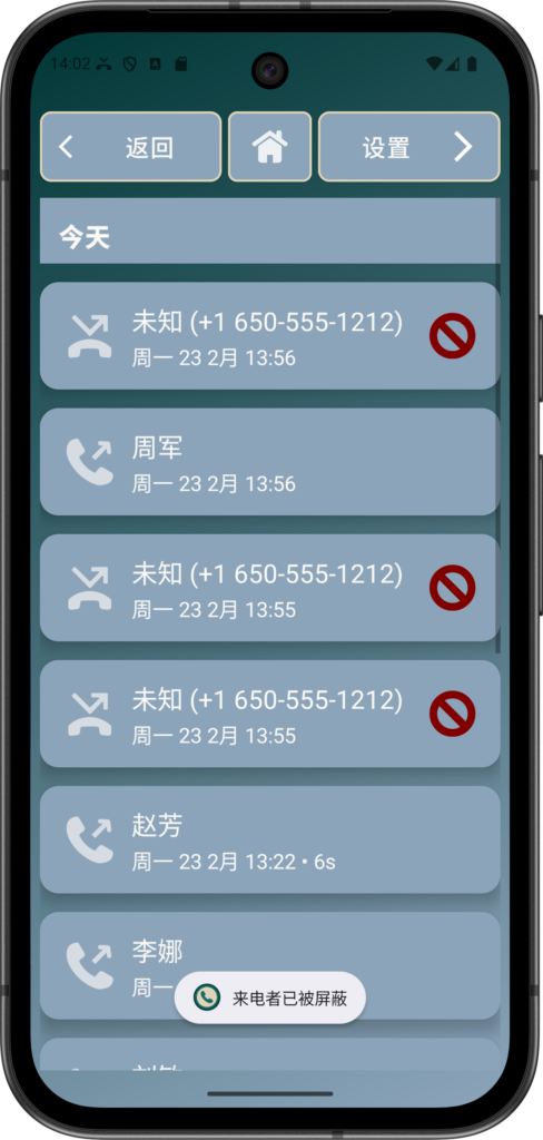 阻止来电功能可保护老年用户免受骚扰电话、推销电话或诈骗电话的困扰,减少压力与混乱。它还能防止相同号码的重复打扰,提高安心感和专注度。