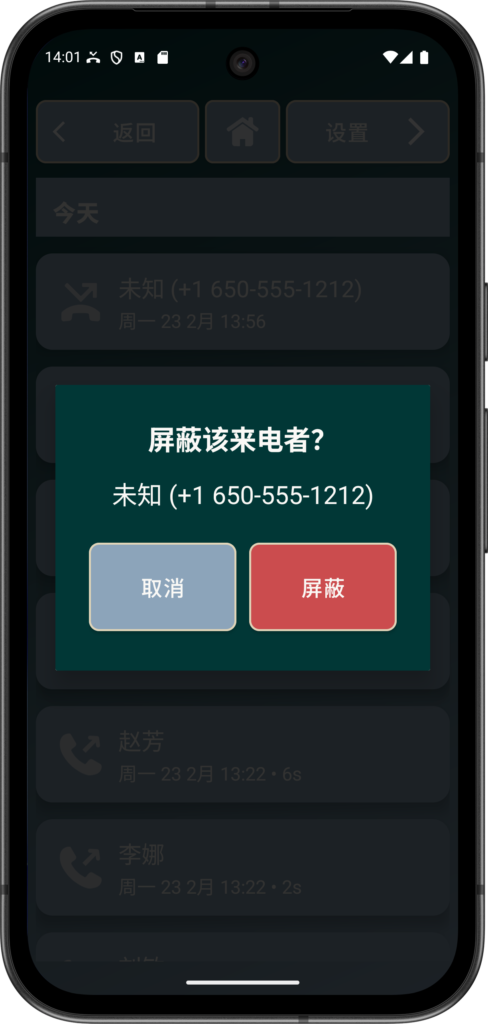 - 短按可回拨之前的来电者,长按可进行阻止设置:
