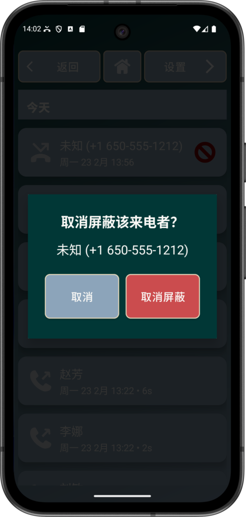 您可以使用相同方法取消阻止任何已阻止的联系人(即在通话记录中对已阻止联系人进行 按住并保持 然后选择 取消屏蔽)。