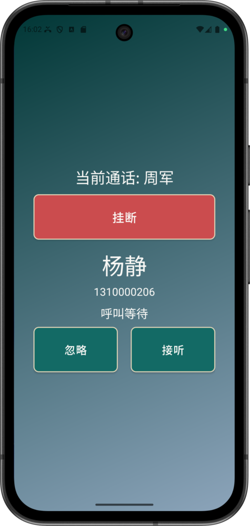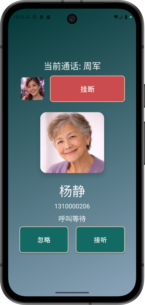 挂断—— 挂断与 周军 的通话并开始与 杨静 通话。