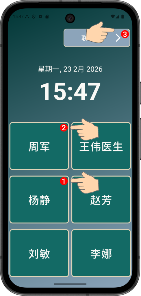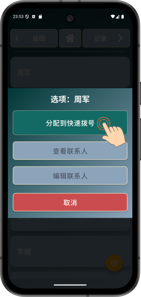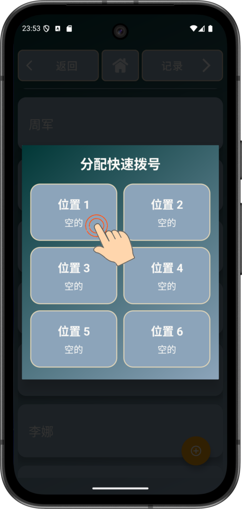 周军 现在已成为 插槽 1 中的快速拨号按钮,只需点击即可拨打。