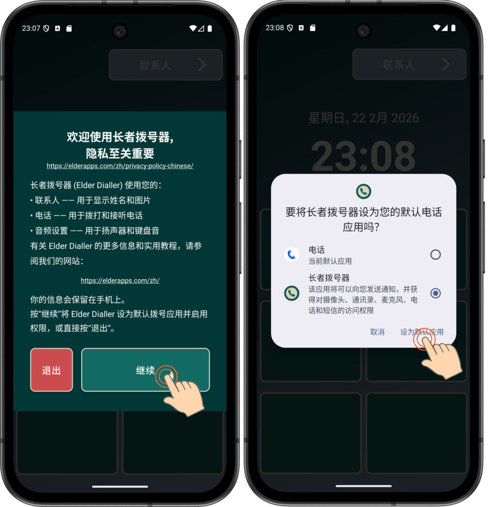 请选择 设为默认应用 以使 Elder Dialler 完整运行。