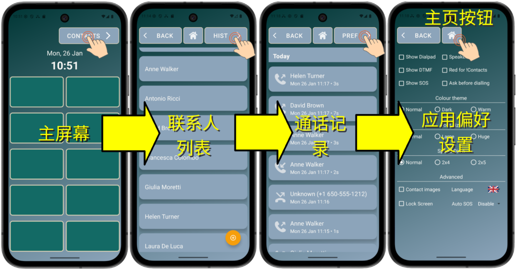 Elder Dialler 设计了四个主要用户界面,可通过屏幕顶部的按钮进行选择。