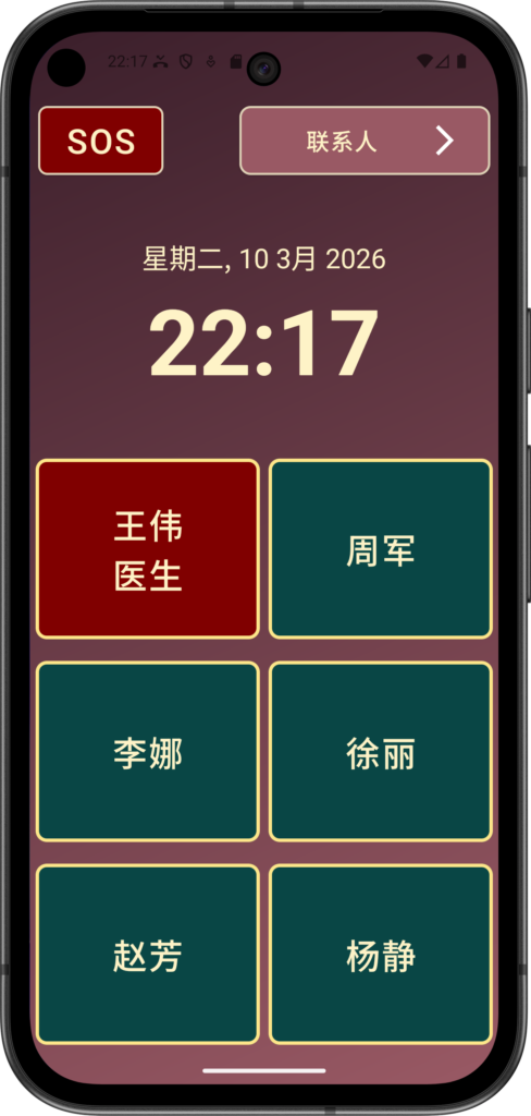 键即可拨打亲人或紧急需要联系的人。