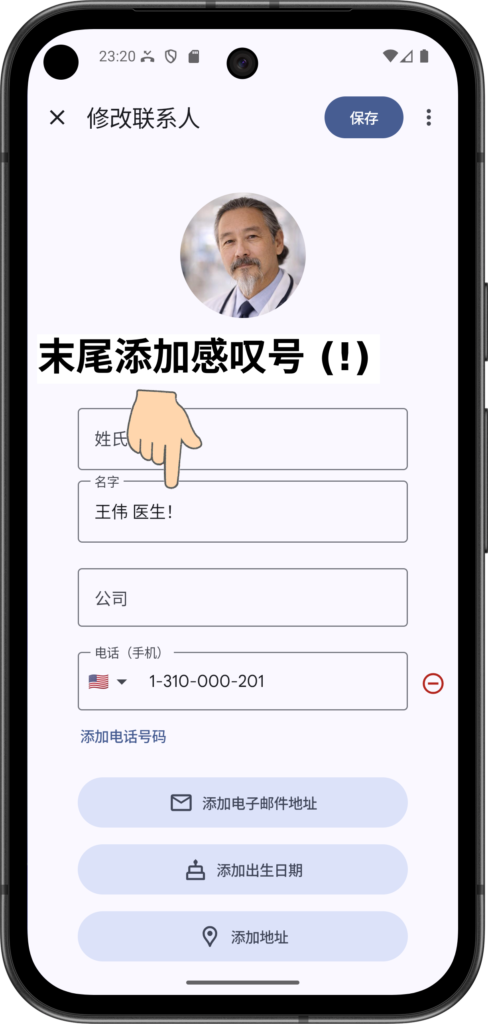 当联系人姓名包含感叹号时(!) 在联系人应用程序名称中的任何位置添加,然后其关联按钮将以红色突出显示。